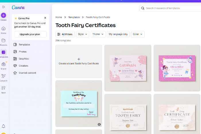 Over at https://www.canva.com/certificates/templates/tooth-fairy/ they have a range of customizable certificate templates.